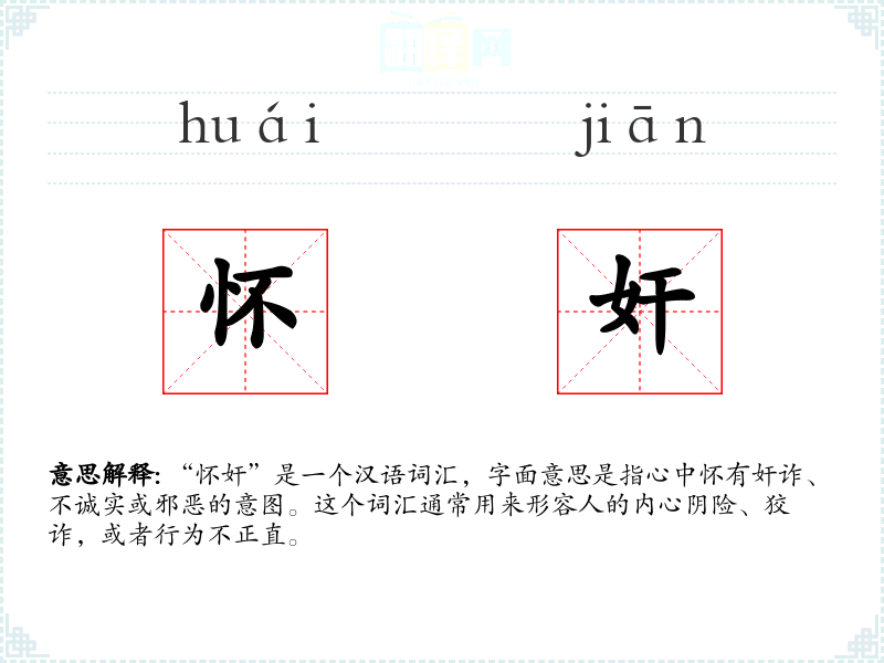 “怀奸”是一个汉语词汇,字面意思是指心中怀有奸诈、不诚实或邪恶的意图。这个词汇通常用来形容人的内心阴险、狡诈,或者行为不正直。