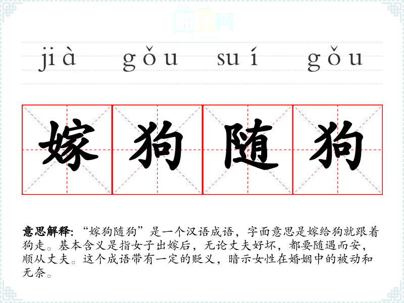 “嫁狗随狗”这个成语的词源并不十分明确,但它反映了**传统社会中对女性的期望和限制。随着社会的发展,这个成语的使用频率可能有所下降,但它仍然存在于一些文学作品和口语表达中。
