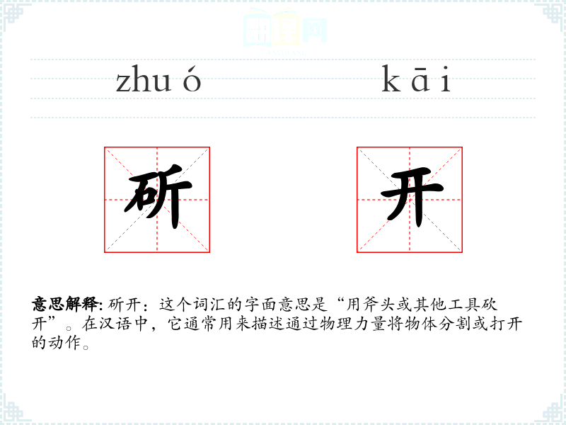 - 专业领域:在木工或建筑领域,“斫开”是一个常用词汇,用来指导如何使用工具进行精确的切割。