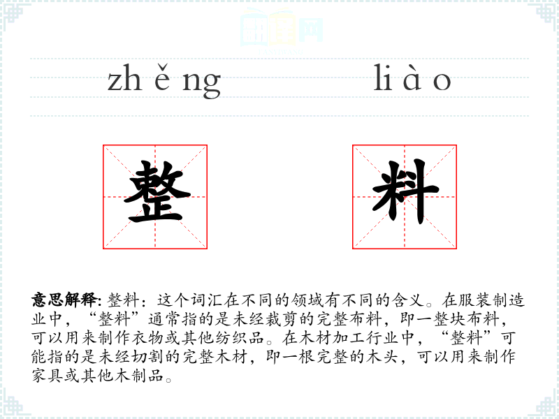 整料:这个词汇在不同的领域有不同的含义。在服装制造业中,“整料”通常指的是未经裁剪的完整布料,即一整块布料,可以用来制作衣物或其他纺织品。在木材加工行业中,“整料”可能指的是未经切割的完整木材,即一根完整的木头,可以用来制作家具或其他木制品。