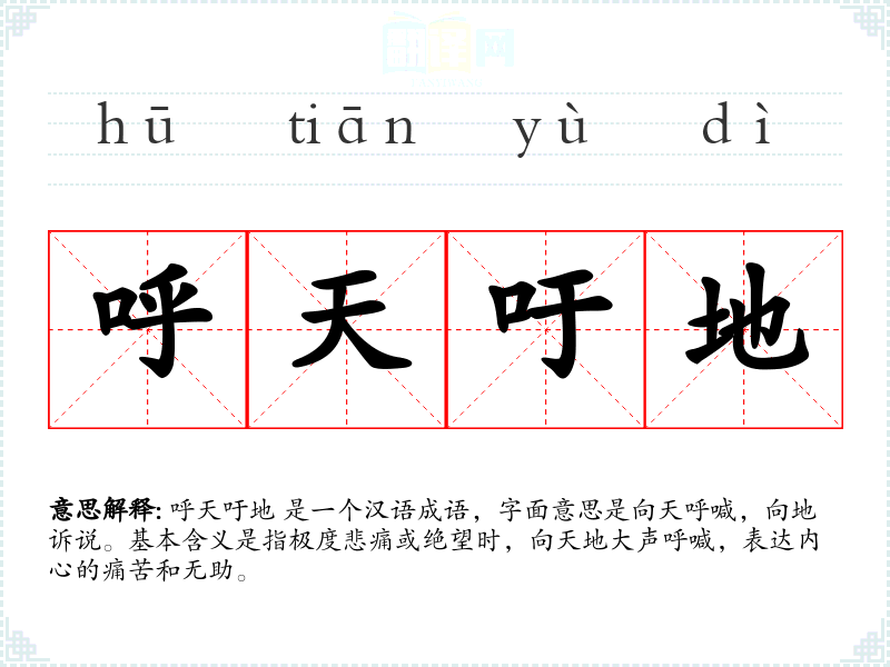 呼天吁地 是一个汉语成语,字面意思是向天呼喊,向地诉说。基本含义是指极度悲痛或绝望时,向天地大声呼喊,表达内心的痛苦和无助。