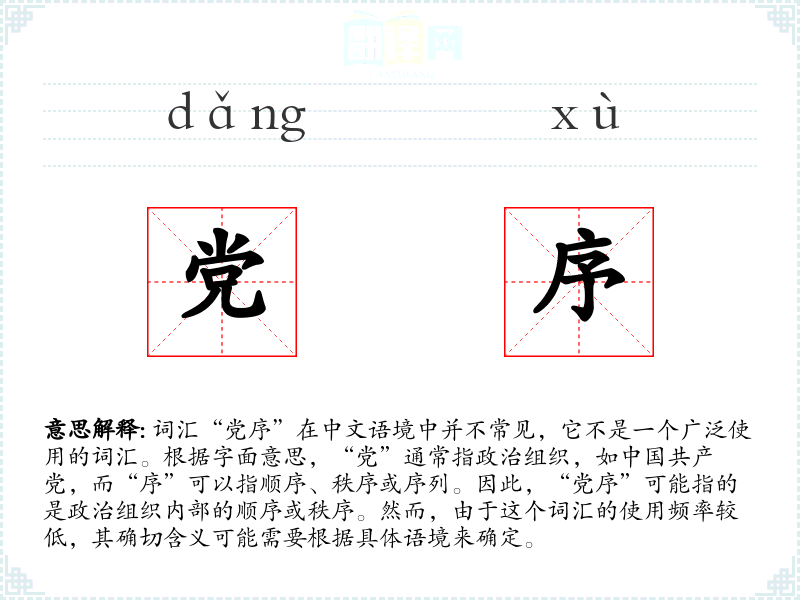 - 词源:“党”源自古代的“党”,指政治组织;“序”源自古代的“序”,指顺序或秩序。