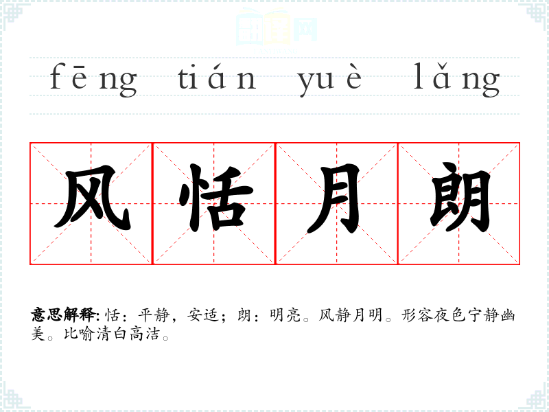 恬:平静,安适;朗:明亮。风静月明。形容夜色宁静幽美。比喻清白高洁。