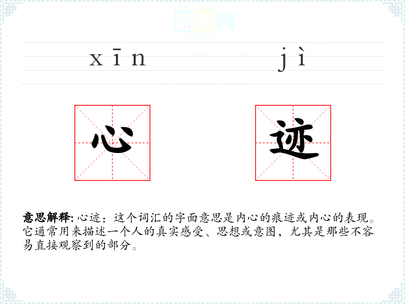 心迹:这个词汇的字面意思是内心的痕迹或内心的表现。它通常用来描述一个人的真实感受、思想或意图,尤其是那些不容易直接观察到的部分。
