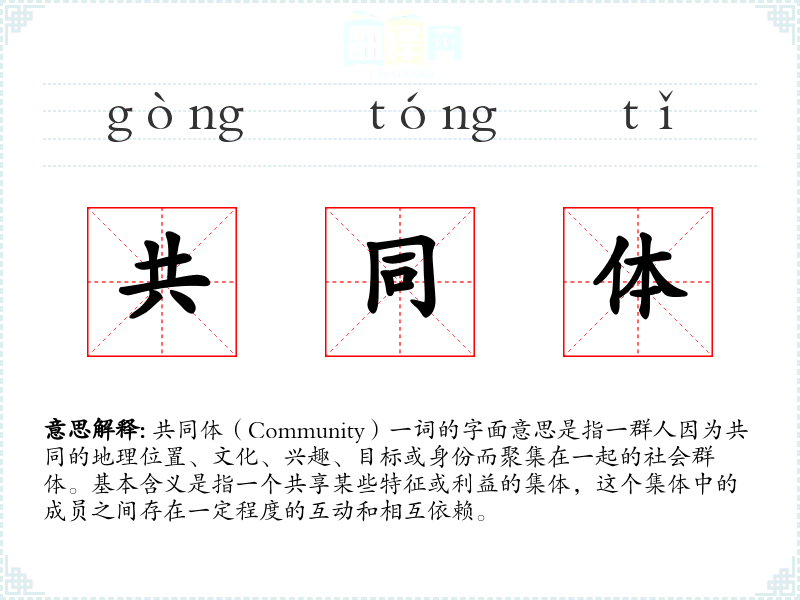 共同体(Community)一词的字面意思是指一群人因为共同的地理位置、文化、兴趣、目标或身份而聚集在一起的社会群体。基本含义是指一个共享某些特征或利益的集体,这个集体中的成员之间存在一定程度的互动和相互依赖。