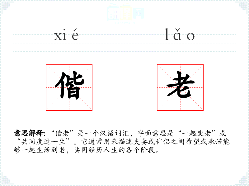 “偕老”是一个汉语词汇,字面意思是“一起变老”或“共同度过一生”。它通常用来描述夫妻或伴侣之间希望或承诺能够一起生活到老,共同经历人生的各个阶段。
