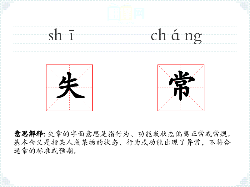 “失常”一词源于汉语,由“失”和“常”两个字组成。在古代汉语中,“失”表示失去或偏离,“常”表示常规或常态。随着时间的推移,这个词的含义逐渐固定为描述偏离正常状态的情况。