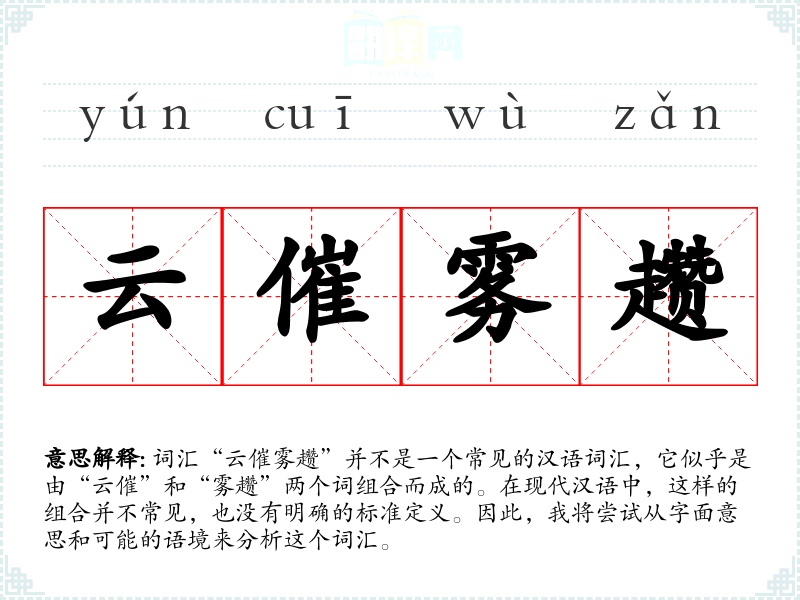 词汇“云催雾趱”并不是一个常见的汉语词汇,它似乎是由“云催”和“雾趱”两个词组合而成的。在现代汉语中,这样的组合并不常见,也没有明确的标准定义。因此,我将尝试从字面意思和可能的语境来分析这个词汇。