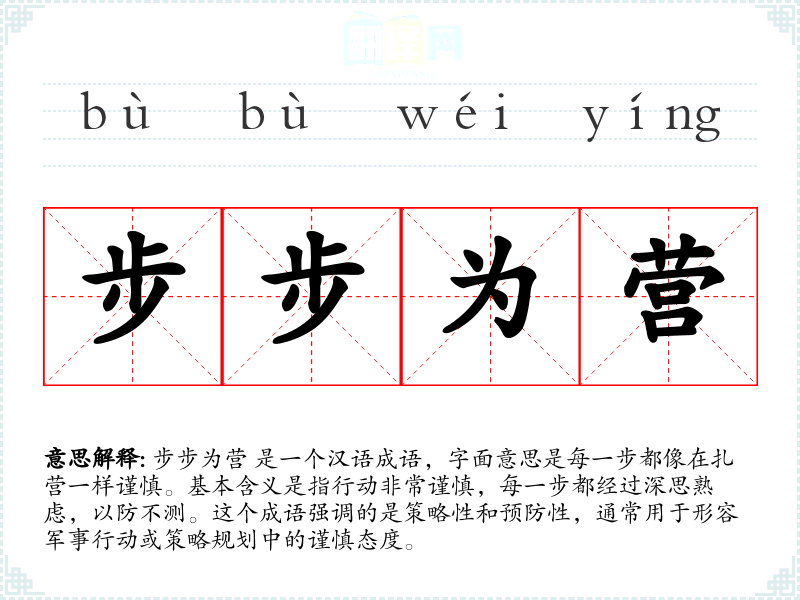 “步步为营”源自古代军事策略,最初用于描述军队在行进中的谨慎部署。随着时间的推移,这个成语的含义扩展到了更广泛的策略和谨慎行动的领域。