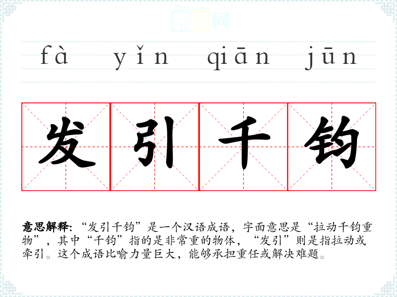 “发引千钧”是一个汉语成语,字面意思是“拉动千钧重物”,其中“千钧”指的是非常重的物体,“发引”则是指拉动或牵引。这个成语比喻力量巨大,能够承担重任或解决难题。