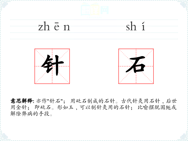 亦作"针石"; 用砭石制成的石针。古代针灸用石针﹐后世用金针; 即砭石。形如玉﹐可以制针灸用的石针; 比喻摆脱困阨或解除弊病的手段。
