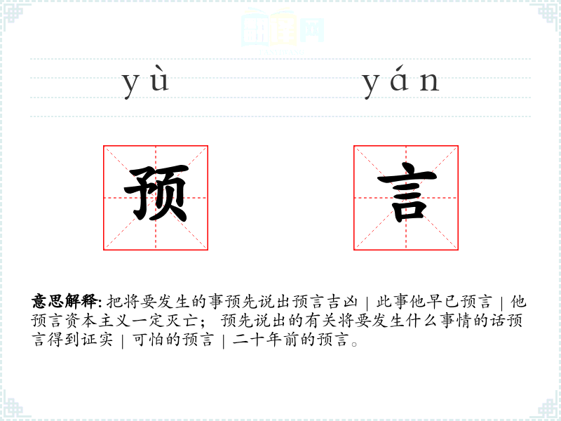 把将要发生的事预先说出预言吉凶|此事他早已预言|他预言资本主义一定灭亡; 预先说出的有关将要发生什么事情的话预言得到证实|可怕的预言|二十年前的预言。