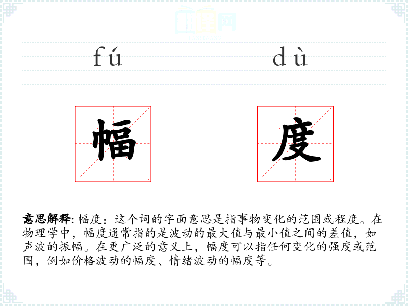 幅度:这个词的字面意思是指事物变化的范围或程度。在物理学中,幅度通常指的是波动的最大值与最小值之间的差值,如声波的振幅。在更广泛的意义上,幅度可以指任何变化的强度或范围,例如价格波动的幅度、情绪波动的幅度等。