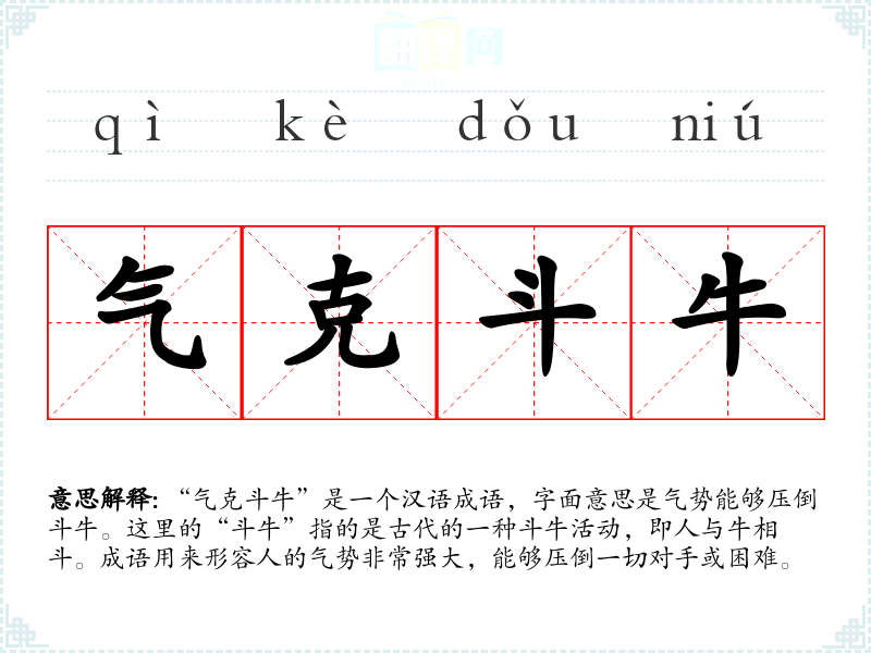 “气克斗牛”是一个汉语成语,字面意思是气势能够压倒斗牛。这里的“斗牛”指的是古代的一种斗牛活动,即人与牛相斗。成语用来形容人的气势非常强大,能够压倒一切对手或困难。