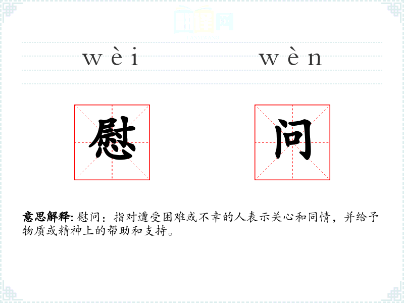 慰问:指对遭受困难或不幸的人表示关心和同情,并给予物质或精神上的帮助和支持。