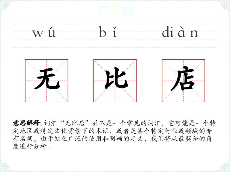 “无比店”的字面意思可能指的是一个店铺或商店,其特点是“无比”,即无与伦比、非常特别或卓越。然而,由于缺乏具体的使用实例,这个定义是推测性的。