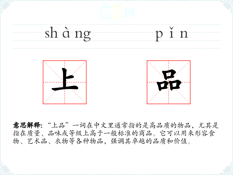 - 同义词:精品、极品、佳品。这些词汇都强调物品的高质量和卓越性,但“上品”更侧重于等级和品味上的高水准。