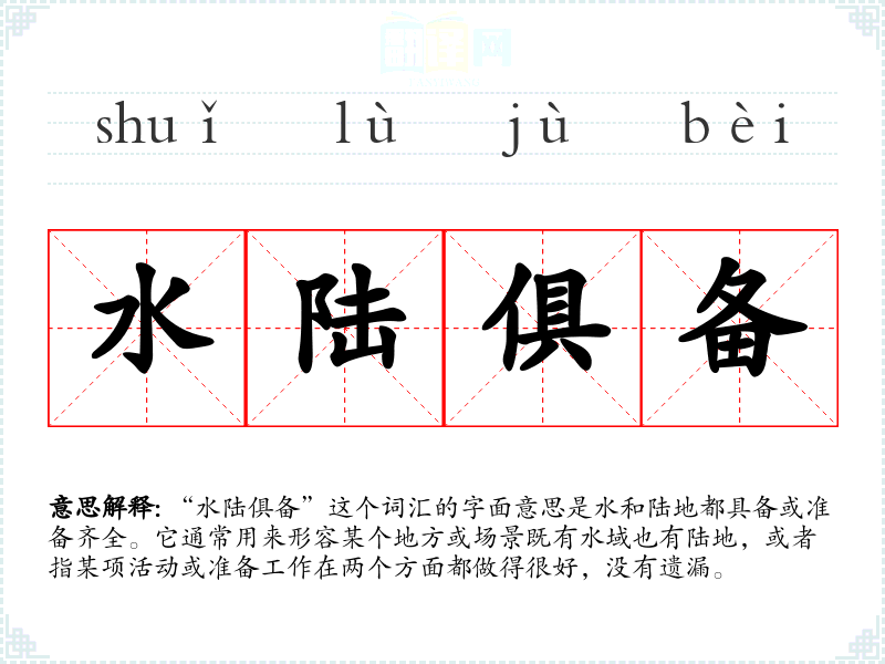“水陆俱备”这个词汇的字面意思是水和陆地都具备或准备齐全。它通常用来形容某个地方或场景既有水域也有陆地,或者指某项活动或准备工作在两个方面都做得很好,没有遗漏。