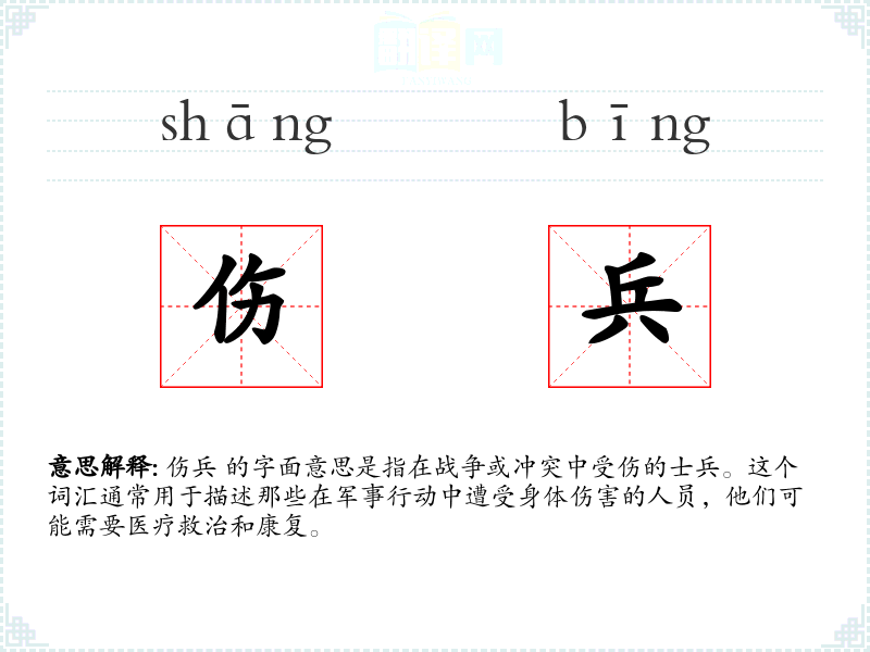 伤兵 的字面意思是指在战争或冲突中受伤的士兵。这个词汇通常用于描述那些在军事行动中遭受身体伤害的人员,他们可能需要医疗救治和康复。