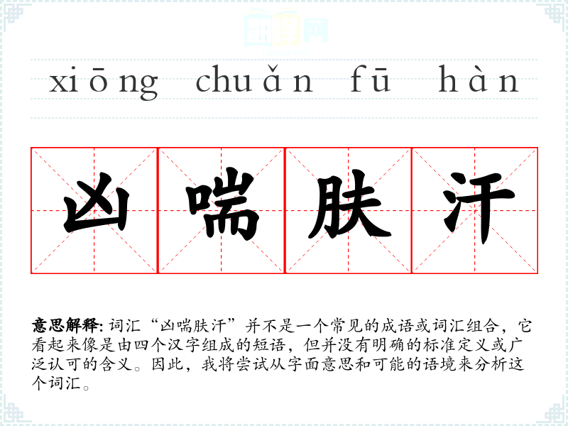 词汇“凶喘肤汗”并不是一个常见的成语或词汇组合,它看起来像是由四个汉字组成的短语,但并没有明确的标准定义或广泛认可的含义。因此,我将尝试从字面意思和可能的语境来分析这个词汇。