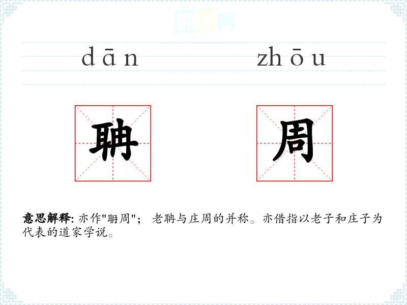 亦作"耼周"; 老聃与庄周的并称。亦借指以老子和庄子为代表的道家学说。
