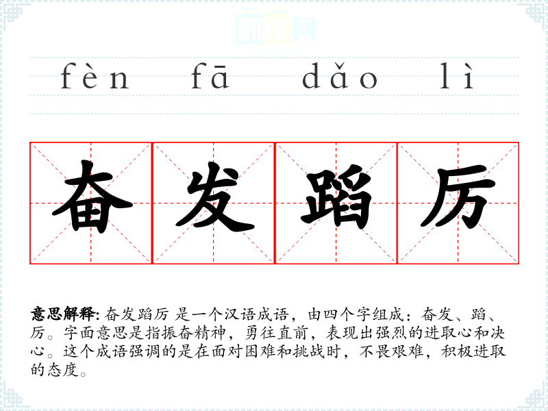 奋发蹈厉 是一个汉语成语,由四个字组成:奋发、蹈、厉。字面意思是指振奋精神,勇往直前,表现出强烈的进取心和决心。这个成语强调的是在面对困难和挑战时,不畏艰难,积极进取的态度。