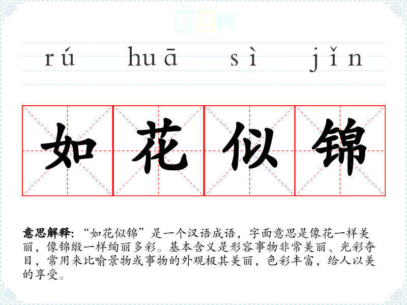“如花似锦”是一个汉语成语,字面意思是像花一样美丽,像锦缎一样绚丽多彩。基本含义是形容事物非常美丽、光彩夺目,常用来比喻景物或事物的外观极其美丽,色彩丰富,给人以美的享受。