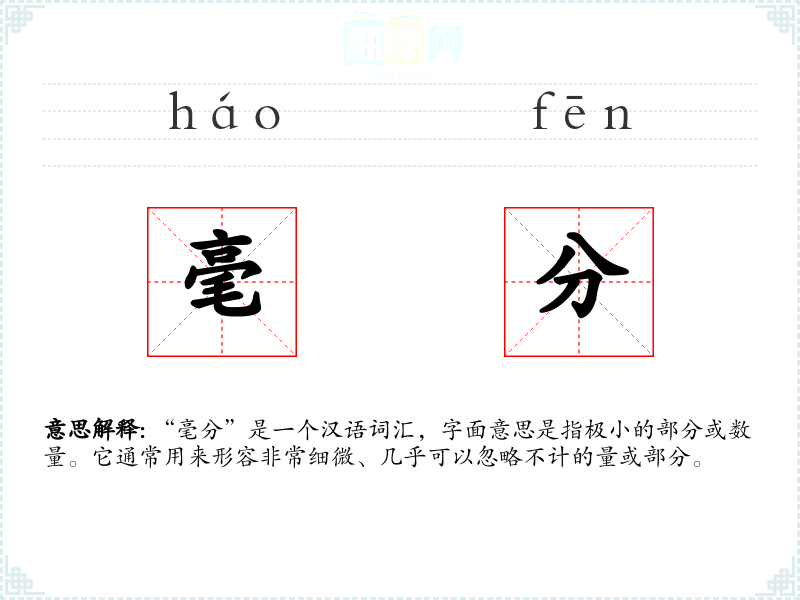 “毫分”是一个汉语词汇,字面意思是指极小的部分或数量。它通常用来形容非常细微、几乎可以忽略不计的量或部分。