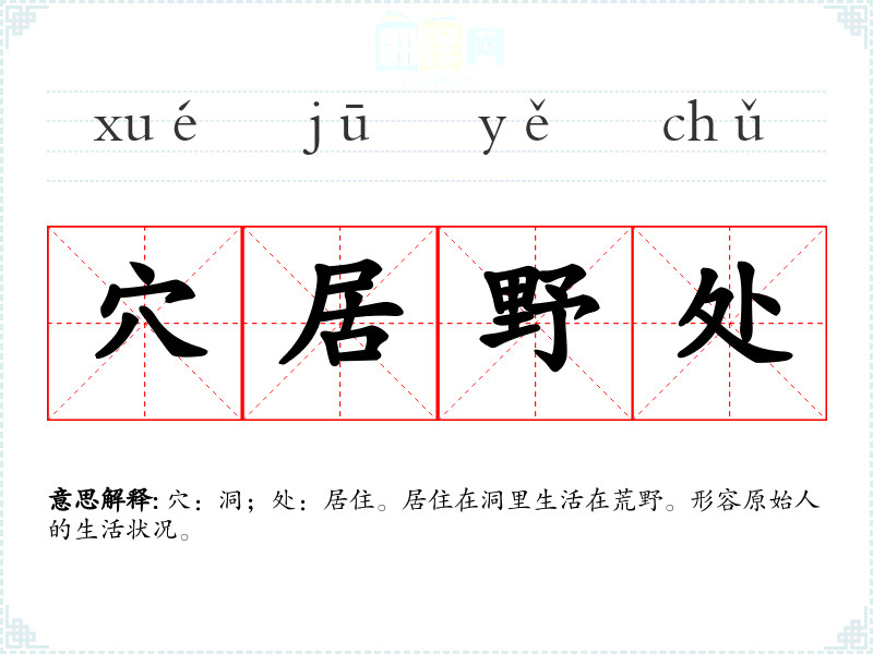 穴:洞;处:居住。居住在洞里生活在荒野。形容原始人的生活状况。