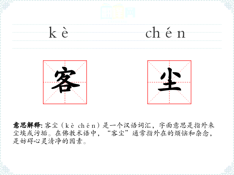 客尘(kè chén)是一个汉语词汇,字面意思是指外来尘埃或污垢。在**术语中,“客尘”通常指外在的烦恼和杂念,是妨碍心灵清净的因素。