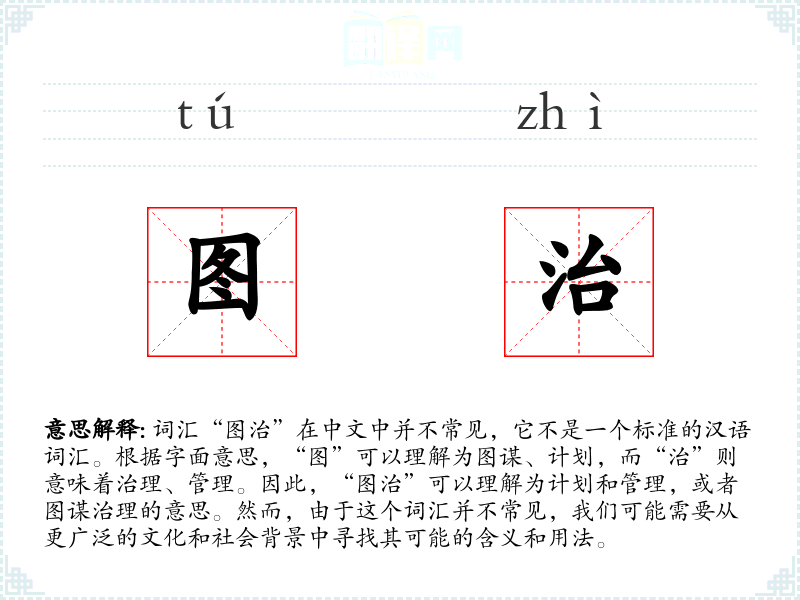 词汇“图治”在中文中并不常见,它不是一个标准的汉语词汇。根据字面意思,“图”可以理解为图谋、计划,而“治”则意味着治理、管理。因此,“图治”可以理解为计划和管理,或者图谋治理的意思。然而,由于这个词汇并不常见,我们可能需要从更广泛的文化和社会背景中寻找其可能的含义和用法。