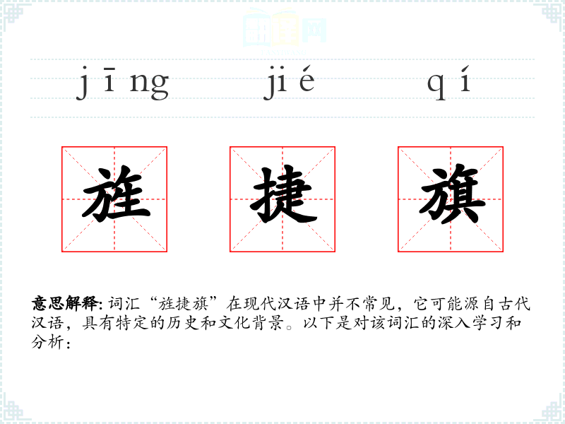 词汇“旌捷旗”在现代汉语中并不常见,它可能源自古代汉语,具有特定的历史和文化背景。以下是对该词汇的深入学*和分析: