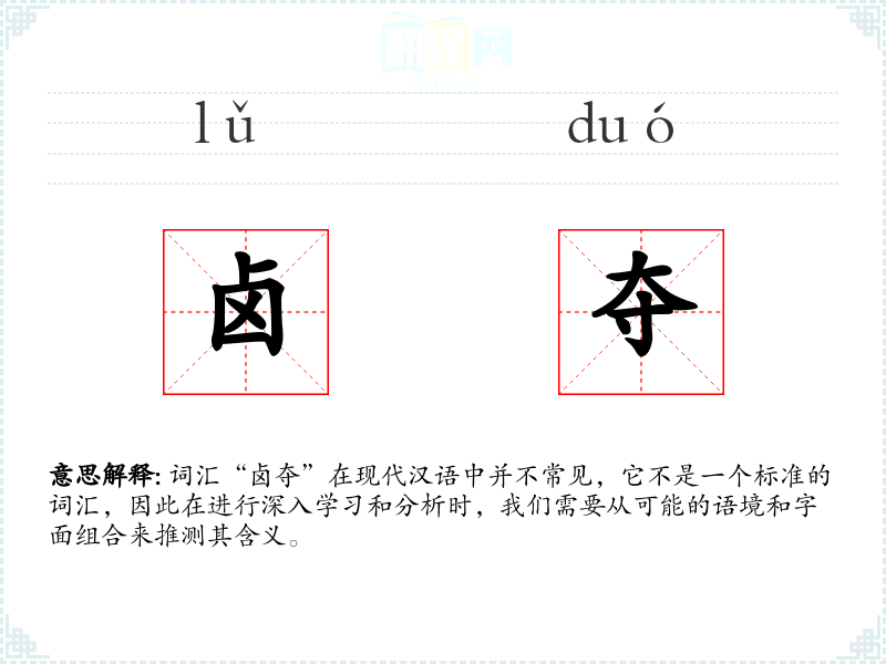 词汇“卤夺”在现代汉语中并不常见,它不是一个标准的词汇,因此在进行深入学习和分析时,我们需要从可能的语境和字面组合来推测其含义。