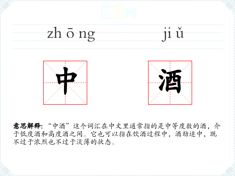 在英语中,可能没有直接对应“中酒”的词汇,但可以用“medium-strength alcohol”或“moderately strong drink”来表达类似的意思。