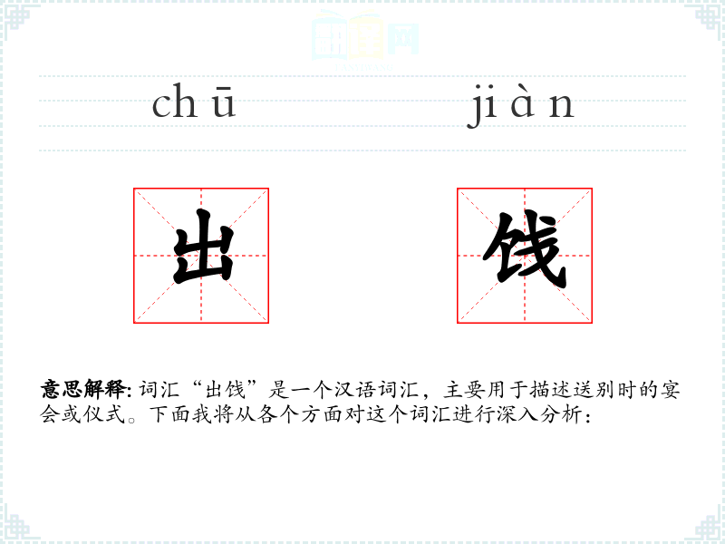 词汇“出饯”是一个汉语词汇,主要用于描述送别时的宴会或仪式。下面我将从各个方面对这个词汇进行深入分析: