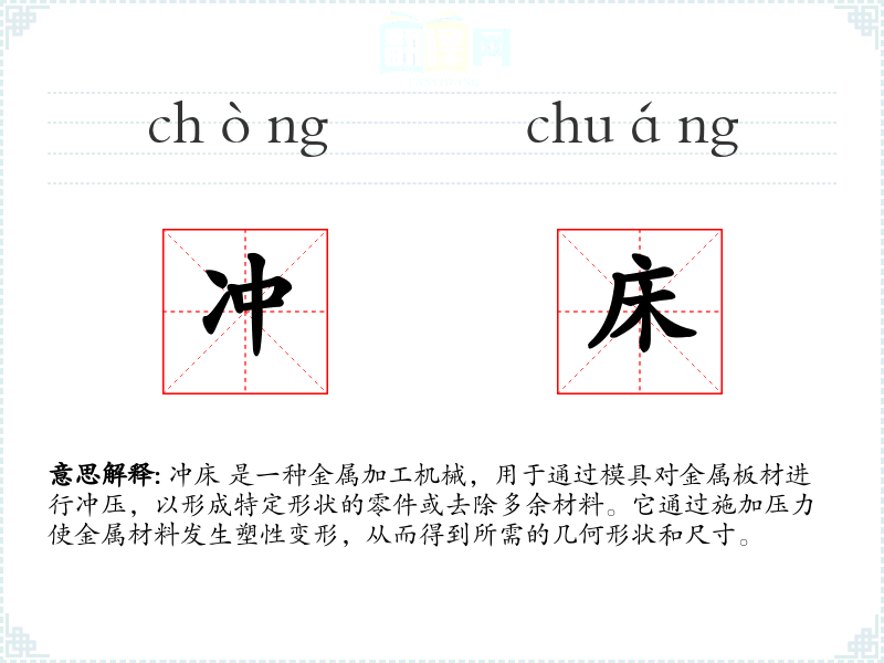 冲床 一词源自中文,由“冲”和“床”两个字组成。其中,“冲”指的是冲击或冲压的动作,“床”在这里指的是机械设备的基础或平台。随着工业技术的发展,冲床的设计和功能也在不断进步和演变。