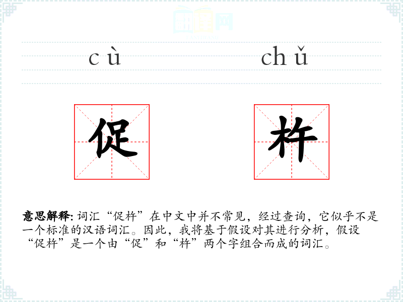 词汇“促杵”在中文中并不常见,经过查询,它似乎不是一个标准的汉语词汇。因此,我将基于假设对其进行分析,假设“促杵”是一个由“促”和“杵”两个字组合而成的词汇。