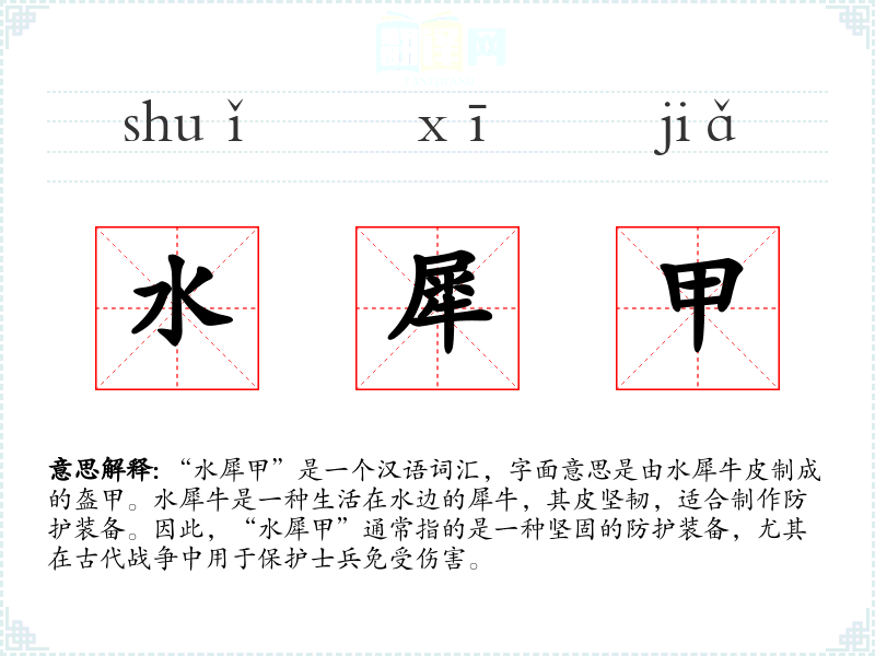 “水犀甲”是一个汉语词汇,字面意思是由水犀牛皮制成的盔甲。水犀牛是一种生活在水边的犀牛,其皮坚韧,适合制作防护装备。因此,“水犀甲”通常指的是一种坚固的防护装备,尤其在古代战争中用于保护士兵免受伤害。