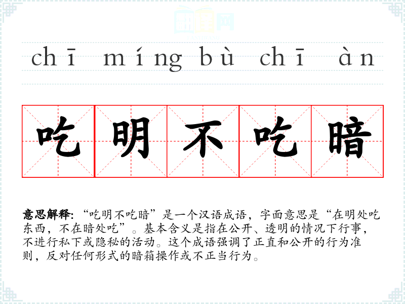“吃明不吃暗”是一个汉语成语,字面意思是“在明处吃东西,不在暗处吃”。基本含义是指在公开、透明的情况下行事,不进行私下或隐秘的活动。这个成语强调了正直和公开的行为准则,反对任何形式的暗箱操作或不正当行为。