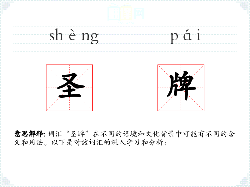词汇“圣牌”在不同的语境和文化背景中可能有不同的含义和用法。以下是对该词汇的深入学*和分析: