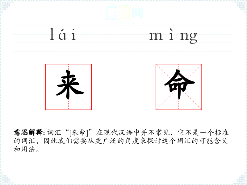 由于“[来命]”不是一个标准词汇,我们可以推测它可能是由两个汉字“来”和“命”组合而成的。字面意思可能是“来到的命令”或“赋予生命”。