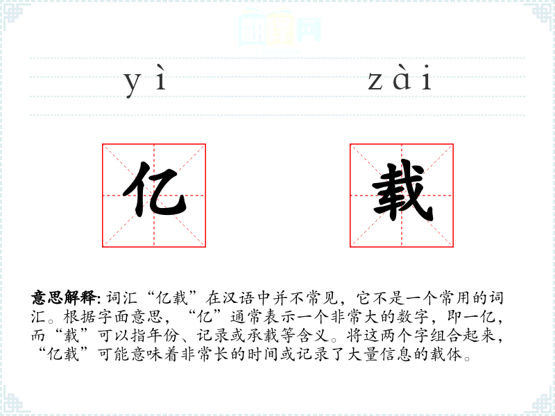 - 在英语中,可能对应的是“millennia”或“vast amount of data”,但“亿载”更具有汉语特有的文化色彩。