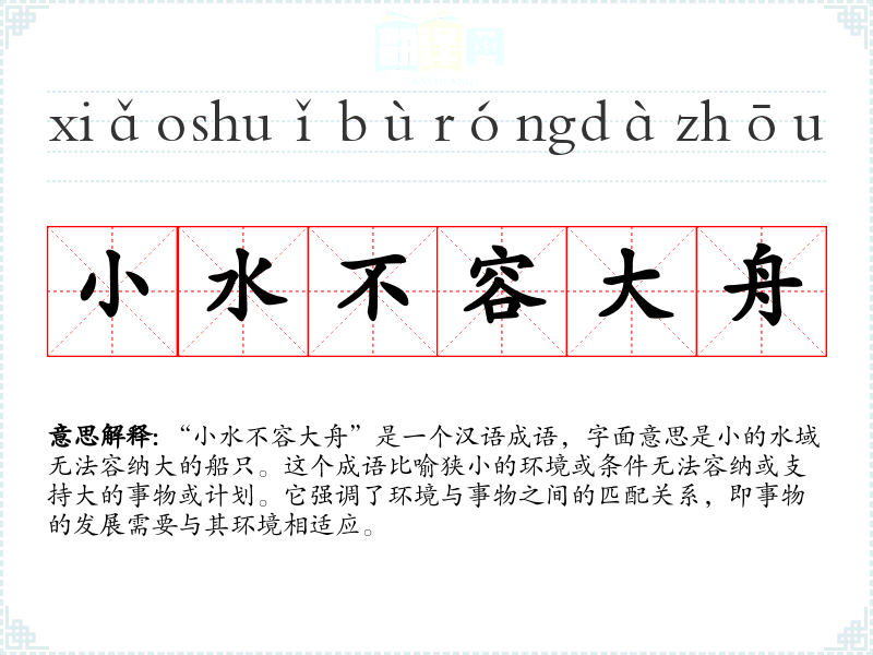 “小水不容大舟”是一个汉语成语,字面意思是小的水域无法容纳大的船只。这个成语比喻狭小的环境或条件无法容纳或支持大的事物或计划。它强调了环境与事物之间的匹配关系,即事物的发展需要与其环境相适应。