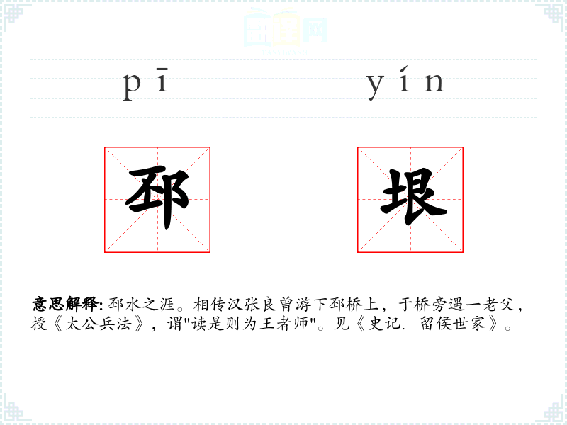 邳水之涯。相传汉张良曾游下邳桥上,于桥旁遇一老父,授《太公兵法》,谓"读是则为王者师"。见《史记.留侯世家》。
