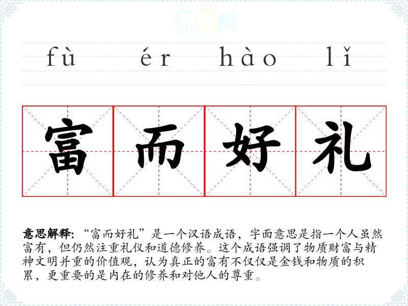 “富而好礼”是一个汉语成语,字面意思是指一个人虽然富有,但仍然注重礼仪和道德修养。这个成语强调了物质财富与精神文明并重的价值观,认为真正的富有不仅仅是金钱和物质的积累,更重要的是内在的修养和对他人的尊重。