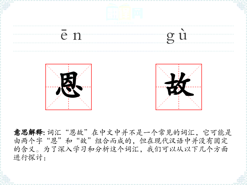 词汇“恩故”在中文中并不是一个常见的词汇,它可能是由两个字“恩”和“故”组合而成的,但在现代汉语中并没有固定的含义。为了深入学*和分析这个词汇,我们可以从以下几个方面进行探讨:
