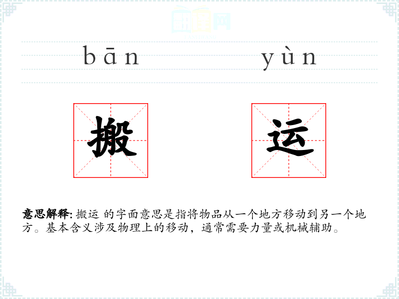 搬运 的字面意思是指将物品从一个地方移动到另一个地方。基本含义涉及物理上的移动,通常需要力量或机械辅助。
