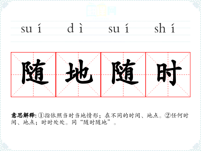 ①指依照当时当地情形;在不同的时间、地点。②任何时间、地点;时时处处。同“