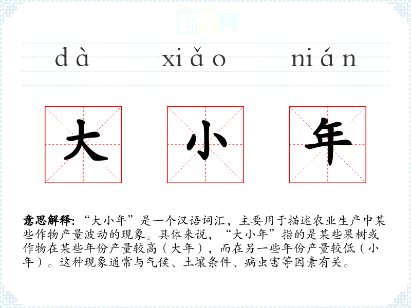 “大小年”是一个汉语词汇,主要用于描述农业生产中某些作物产量波动的现象。具体来说,“大小年”指的是某些果树或作物在某些年份产量较高(大年),而在另一些年份产量较低(小年)。这种现象通常与气候、土壤条件、病虫害等因素有关。