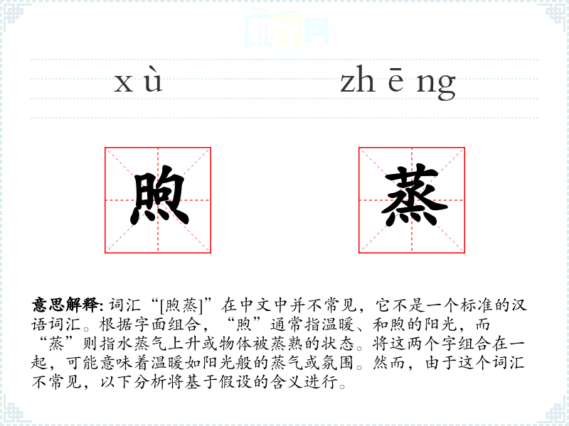 词汇“[煦蒸]”在中文中并不常见,它不是一个标准的汉语词汇。根据字面组合,“煦”通常指温暖、和煦的阳光,而“蒸”则指水蒸气上升或物体被蒸熟的状态。将这两个字组合在一起,可能意味着温暖如阳光般的蒸气或氛围。然而,由于这个词汇不常见,以下分析将基于假设的含义进行。